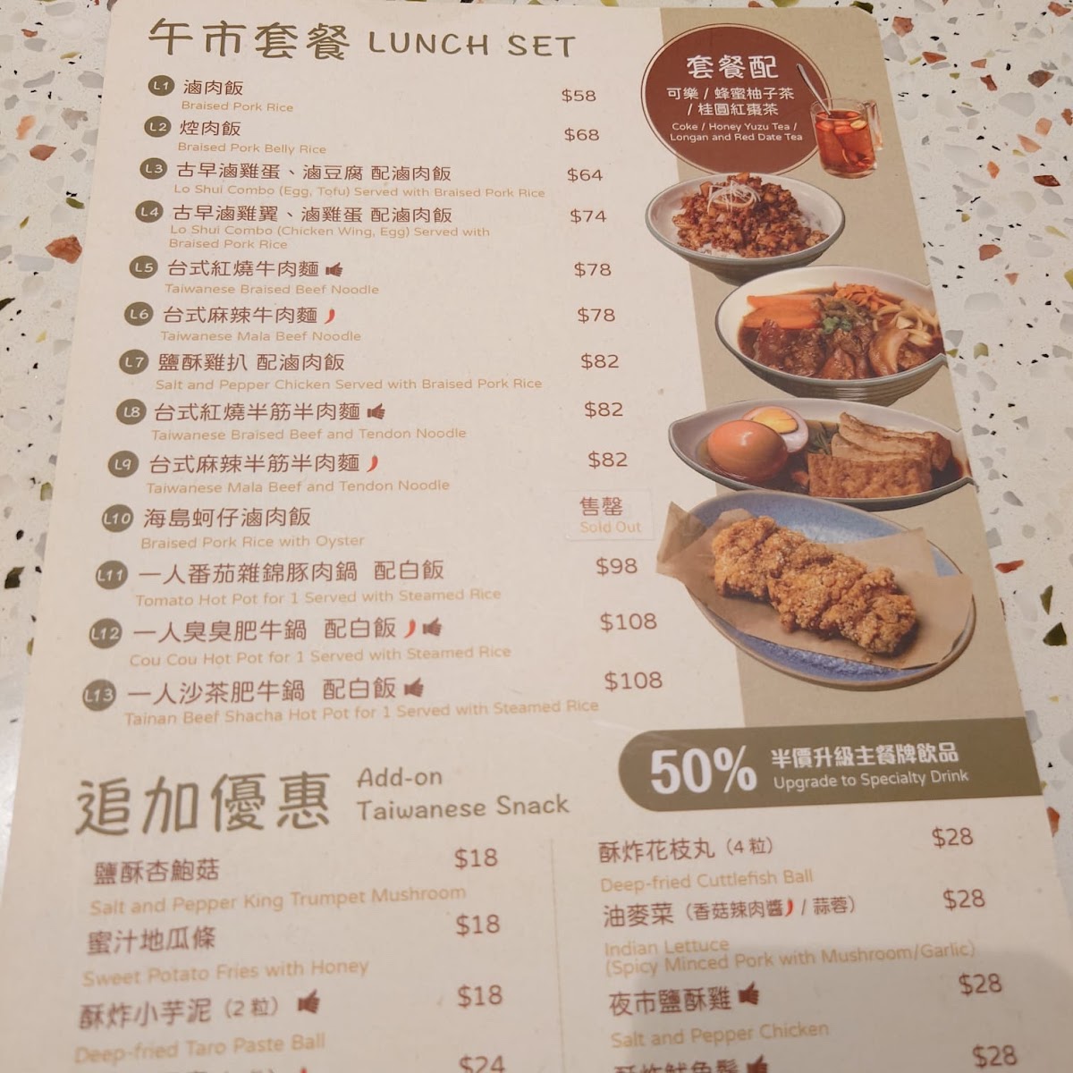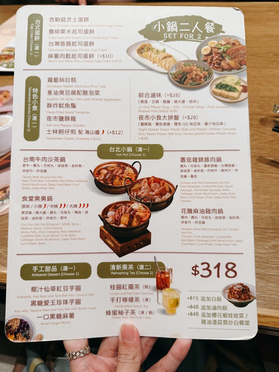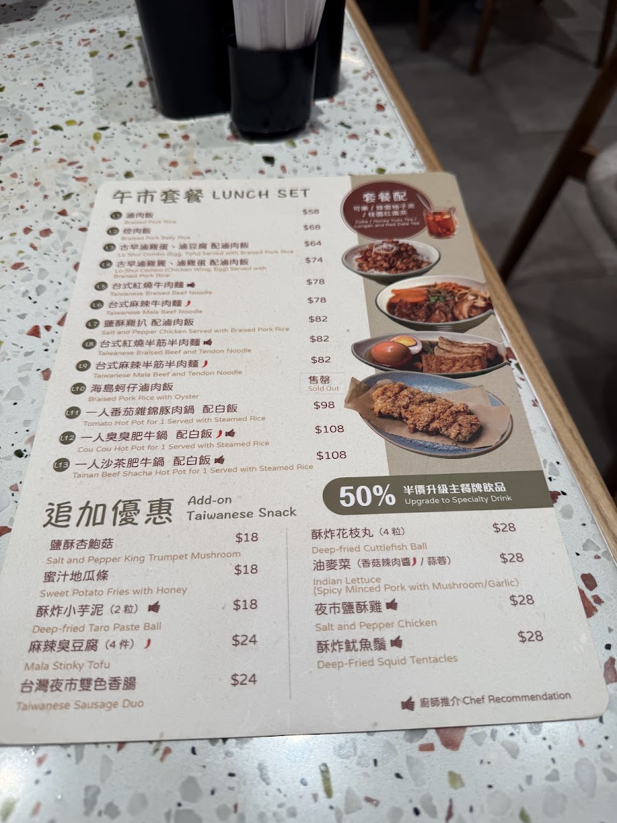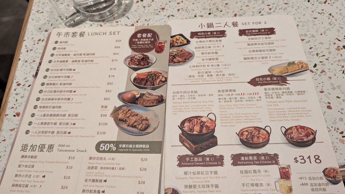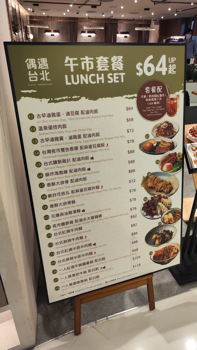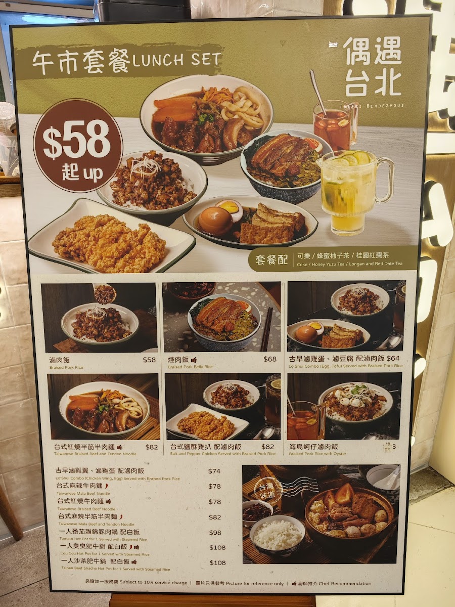 From a reviewer’s perspective, the menu at Taipei Rendezvous (Tsuen Wan Branch) offers a well-rounded snapshot of comforting Taiwanese cuisine, balancing hearty mains, nostalgic snacks, and soothing drinks. The Taiwanese snacks set the tone with crowd-pleasers like Sweet Potato Fries With Honey, Deep-Fried Cuttlefish Ball (6 Pcs), Deep-Fried Pork Rib, Deep-Fried Squid Tentacles, and Salt And Pepper King Trumpet Mushroom, each delivering the familiar street-food flavors that make Taiwanese dining so approachable. The heart of the menu lies in its noodle selection, where classics such as 台式紅燒牛丸麵, Taiwanese Braised Beef Noodle, Taiwanese Braised Beef And Tendon Noodle, and the bolder Taiwanese Numbing Spicy Beef Noodle and Taiwanese Numbing Spicy Beef And Tendon Noodle showcase rich broths and satisfying portions. For rice lovers, options like Braised Pork Rice, 台式紅燒牛肉飯, and Steamed Rice provide comforting alternatives that pair well with the restaurant’s marinated sides, including Pork Ear, Pork Intestine, and Egg (1 Pc). The vegetable offering, Stir-Fried White Cabbage With Pork Lard And Garlic, adds a simple yet aromatic balance to the meal. Drinks further complete the experience, from straightforward choices like Coke, Coke Zero, and Apple Cider, to warming fruit teas such as Longan And Red Date Tea (Hot), Brown Sugar Ginger Tea (Hot), Honey Yuzu Tea (Hot), Honey Yuzu Tea (Iced), and Winter Melon Tea (Iced). Taiwanese-style beverages like Bubble Milk Tea (Iced), Red Bean Milk Tea (Iced), and Grass Jelly Milk Tea (Iced) round things off on a nostalgic note. Overall, the menu feels thoughtfully curated, offering something for both first-time visitors and those craving familiar Taiwanese comfort food.